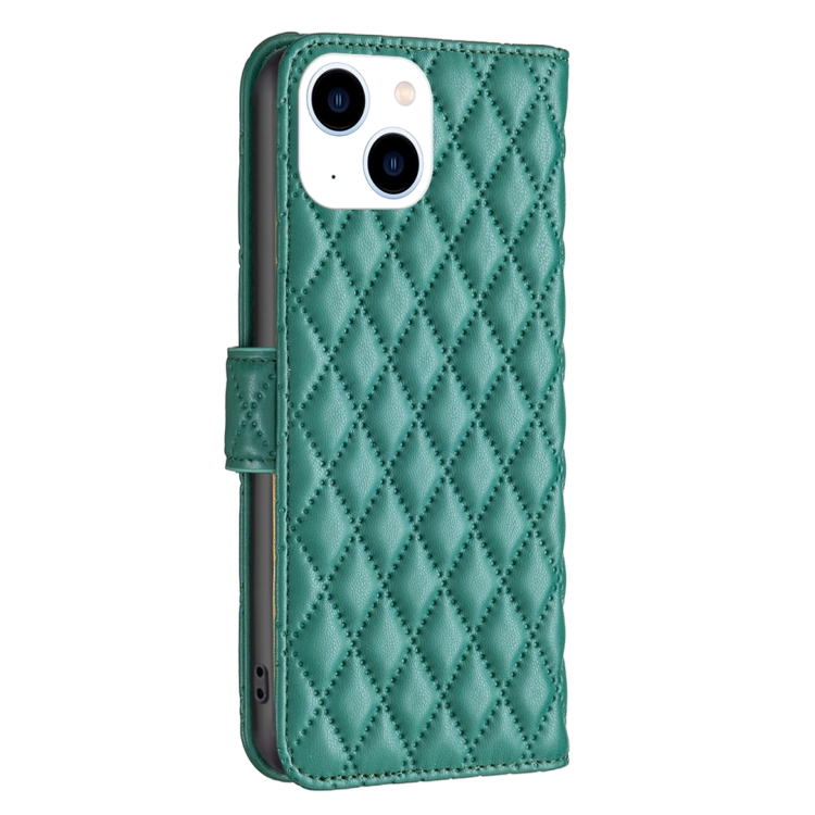 Funda para Teléfono iPhone 15 Diamond Lattice Wallet Flip de Cuero (Verde)