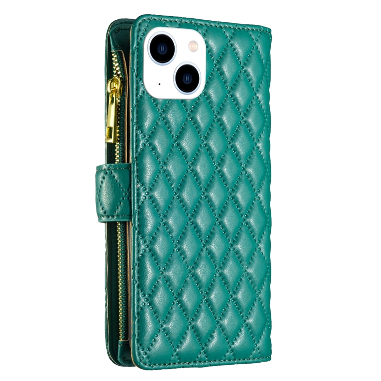 Funda de Cuero para iPhone 15 Diamond Lattice Zipper Wallet con Tapa (Verde)