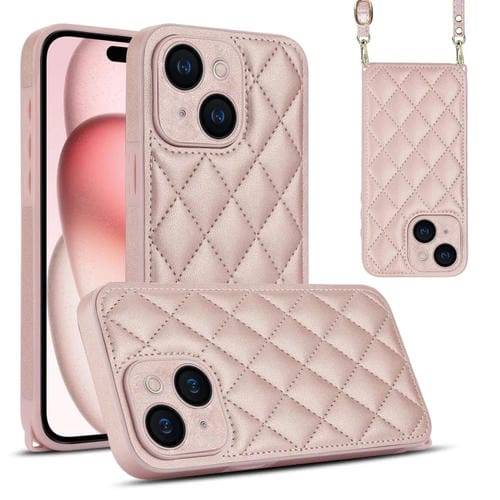 Estuche para Teléfono iPhone 15 Textura Rómbica Cordón Doble (Oro Rosa)