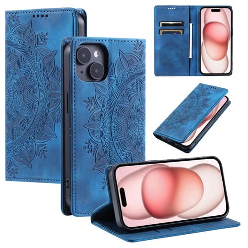 For iPhone 15 Totem Embossed Magnetic Leather Phone Case (Blue)