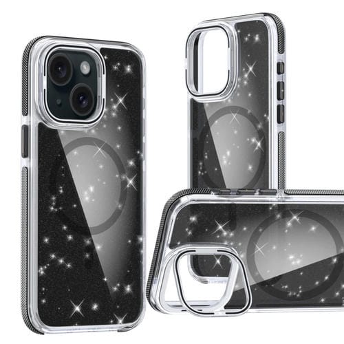 For iPhone 15 Magsafe Phone Case with Two-color Glitter Powder Lens Holder (Black)