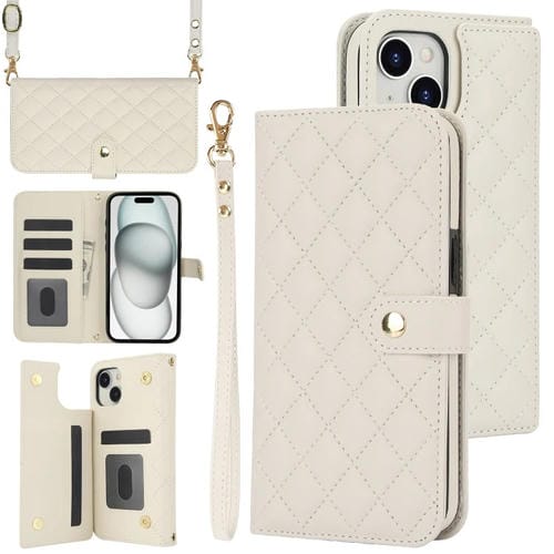 For iPhone 15 Multifunction Rhombic Leather Crossbody Phone Case(White)