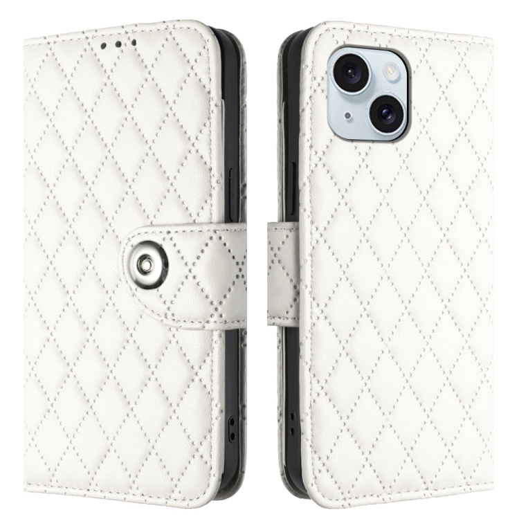 Funda de Cuero para iPhone 15 con Tapa Textura Rómbica y Cordón (Blanco)