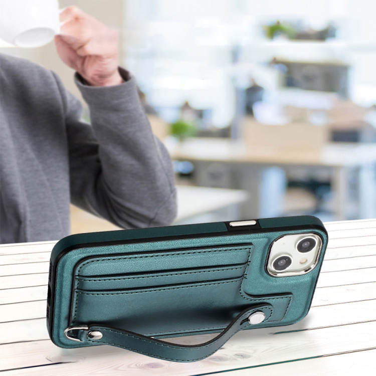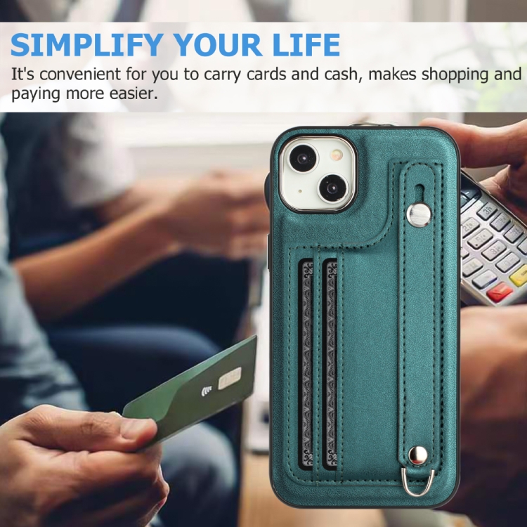Funda de Teléfono iPhone 15 Cuero a Prueba de Golpes con Correa para Muñeca (Verde)