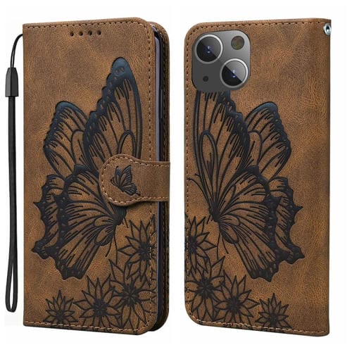 Funda de Teléfono iPhone 15 Cuero con Estampado de Mariposas y Sensación de Piel Retro (Marrón)