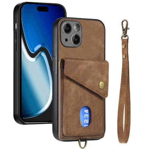 For iPhone 15 Retro Flip Leather Wallet Card Holder Phone Case with Strap (Brown)