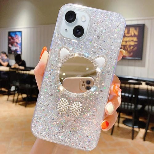 For iPhone 15 Starry Sequins Cat Ears Mirror Epoxy TPU Phone Case(Silver)