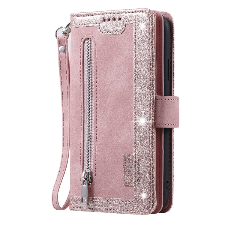 Funda de Cuero para Teléfono Nine Card Zipper Bag para iPhone 15 con Cordón (Rosa)