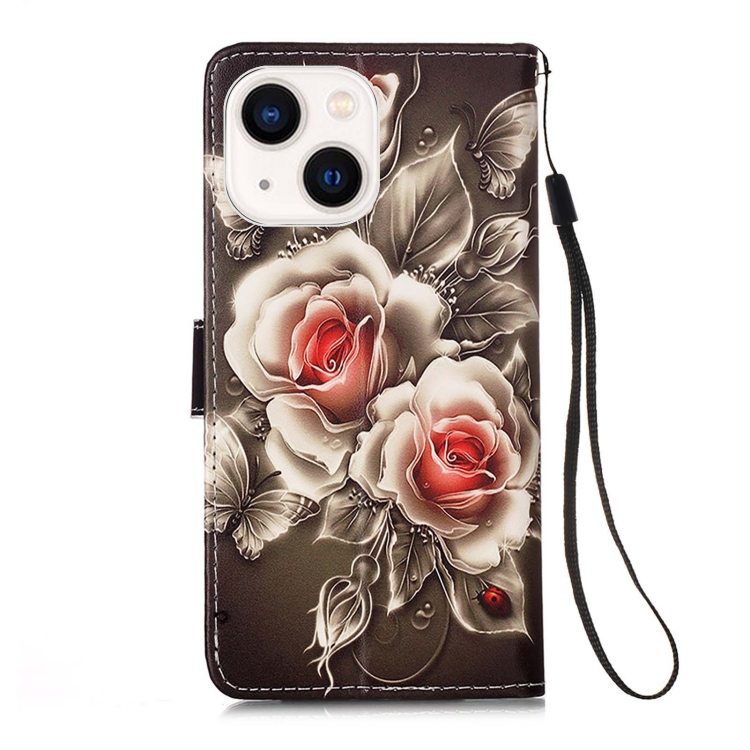 Funda para iPhone 15 Patrón de Dibujo Coloreado Cuero de Tejido Liso (Rosas en Negro)