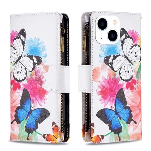 Funda de Cuero para iPhone 15 Patrón de Dibujo Coloreado con Cremallera (Dos Mariposas)