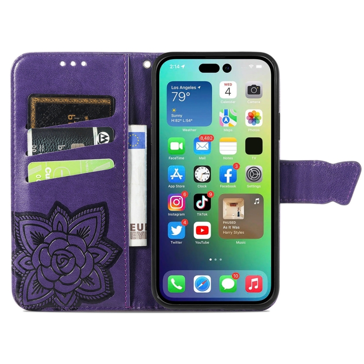 Estuche para Teléfono iPhone 15 Plus Butterfly Love Flower Cuero En Relieve (Púrpura Oscuro)