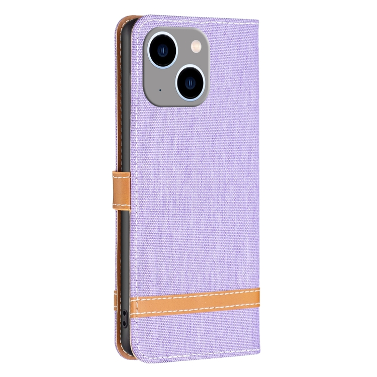 Funda para iPhone 15 Plus Color Block Denim Texture Leather Phone Case (Púrpura)