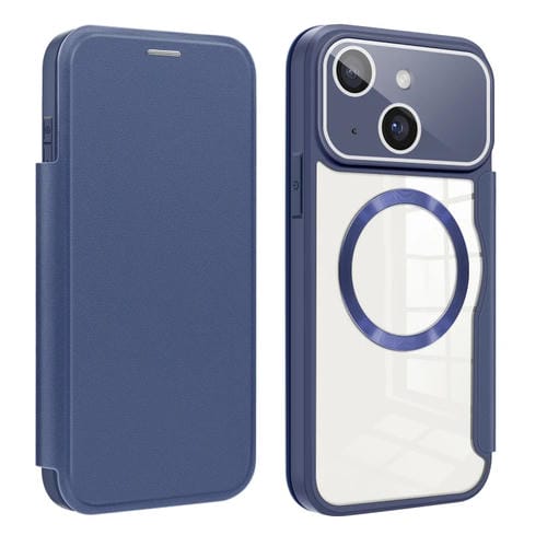 For iPhone 15 Plus Colored Shield MagSafe Magnetic RFID Anti-Theft Leather Phone Case (Blue)