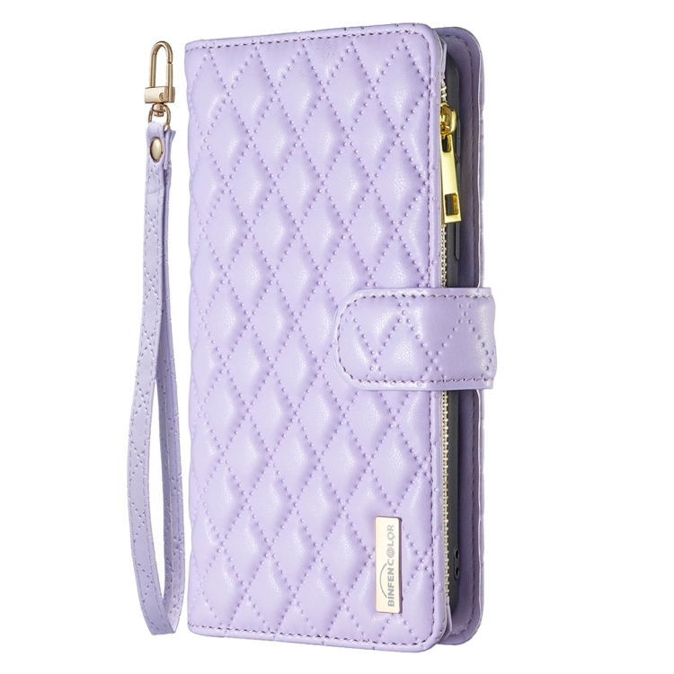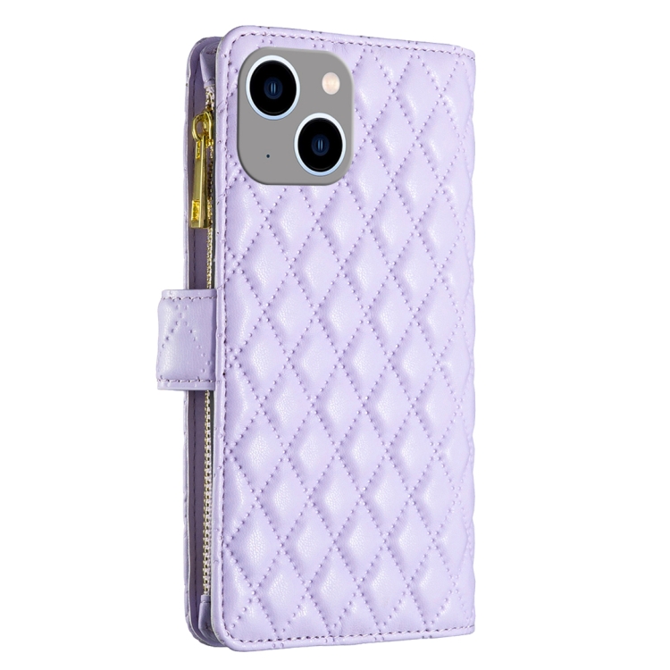 Funda para teléfono iPhone 15 Plus Diamond Lattice Zipper Wallet de cuero con tapa (Púrpura)