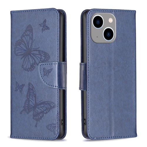Funda para Teléfono Apple iPhone 15 Plus Estampado en Relieve Dos Mariposas Cuero (Azul)