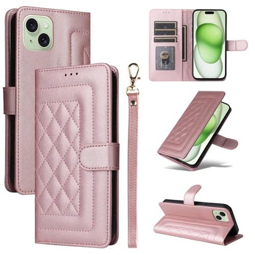 For iPhone 15 Plus Diamond Lattice Leather Flip Phone Case (Rose Gold)