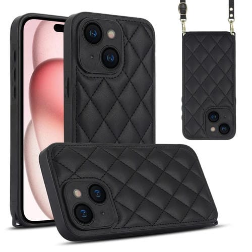 For iPhone 15 Plus Rhombic Texture Phone Case with Double Lanyard (Black)