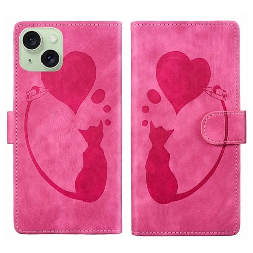 Estuche para teléfono iPhone 15 Plus cuero con relieve de gato y corazón (Rosa)