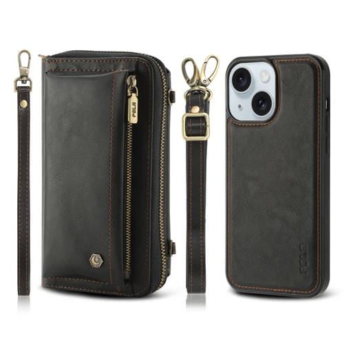 For iPhone 15 Plus Crossbody Phone Case Leather Wallet Multi-Function Zipper Purse (Black)