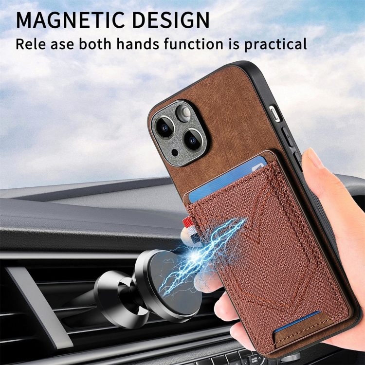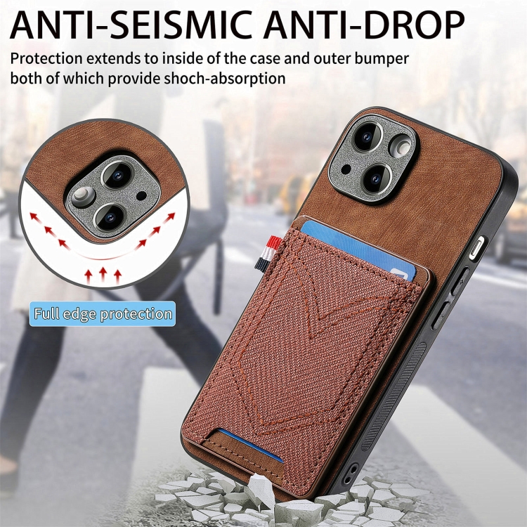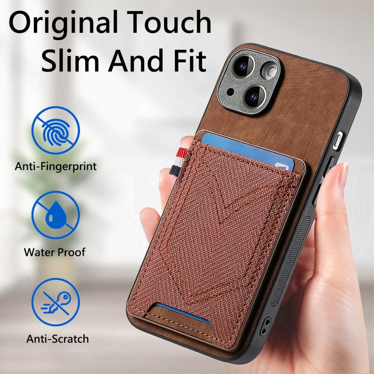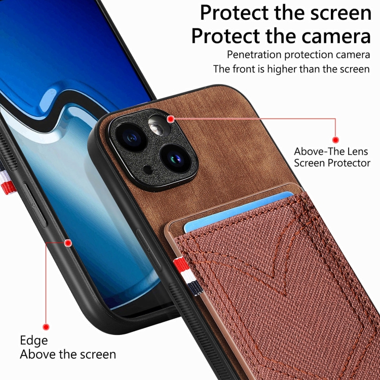Funda para iPhone 15 Plus de Piel de Cuero con Textura de Mezclilla y Ranura para Tarjeta (Marrón)
