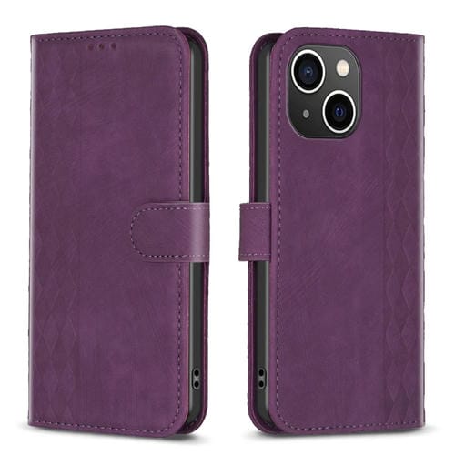 For iPhone 15 Plus Plaid Embossed Leather Phone Case (Purple)