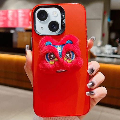For iPhone 15 Plus New Year Lion Dance Plush Doll Phone Case (Red Lion with Red Back)