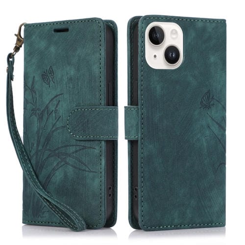 For iPhone 15 Plus Orchid Butterfly Embossed Leather Phone Case (Green)