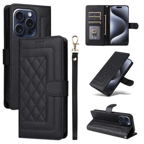 Funda para iPhone 15 Pro Diamond Lattice de Cuero con Tapa para Teléfono (Negro)