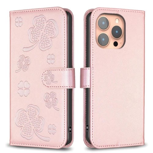 Funda para iPhone 15 Pro Cuero con Relieve de Cuatro Hojas (Rosa)