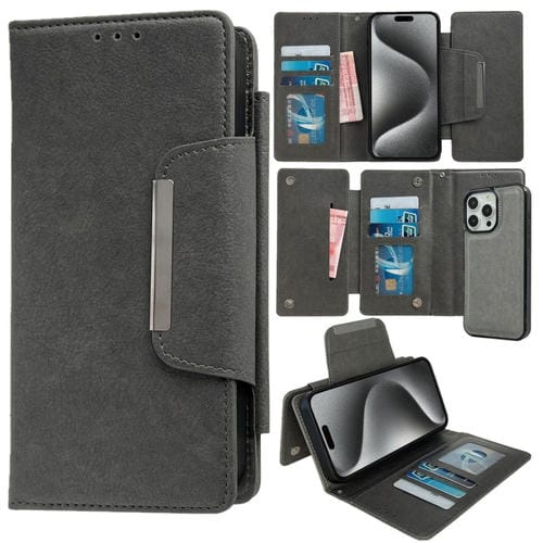 Funda de Cuero para Teléfono iPhone 15 Pro con Billetera Multifuncional para 7 Tarjetas (Gris)