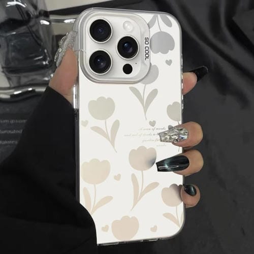 Caja de Teléfono Híbrida TPU PC para iPhone 15 Pro Max con Pintura Plateada (Tulipanes Huecos Blancos)