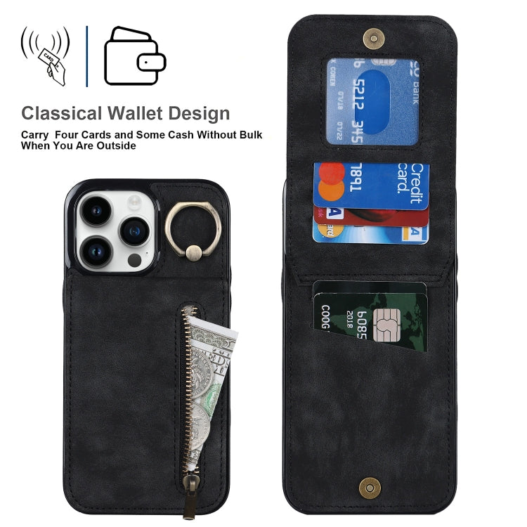 Estuche para teléfono iPhone 15 Pro Max con ranura para tarjeta RFID, anillo retro y cremallera (Negro)