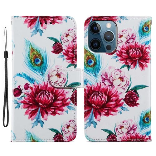 Estuche para Teléfono iPhone 15 Pro Max Cuero Dibujo Coloreado Flor de Pavo Real