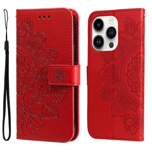 Estuche para teléfono iPhone 15 Pro Max Cuero Estampado Flores 7 Pétalos (Rojo)