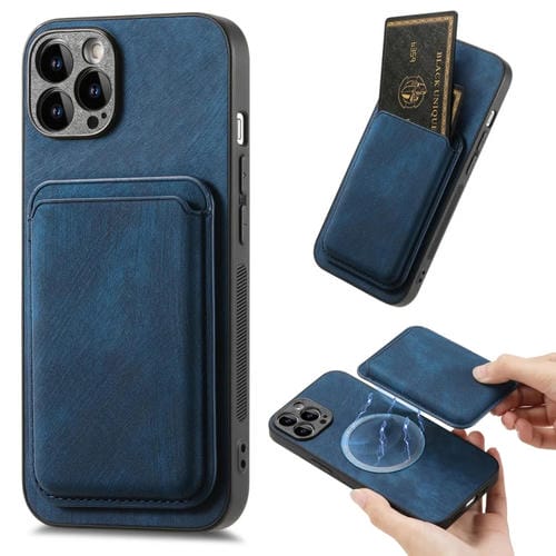 Funda de Teléfono iPhone 15 Pro Max Magnética con Bolsa de Tarjeta de Cuero Retro (Azul)