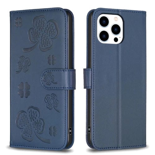 Funda para Teléfono iPhone 15 Pro Max Cuero con Relieve de Cuatro Hojas (Azul)