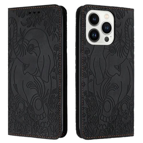 Funda para Teléfono iPhone 15 Pro Max Cuero Relieve Elefante Retro (Negro)