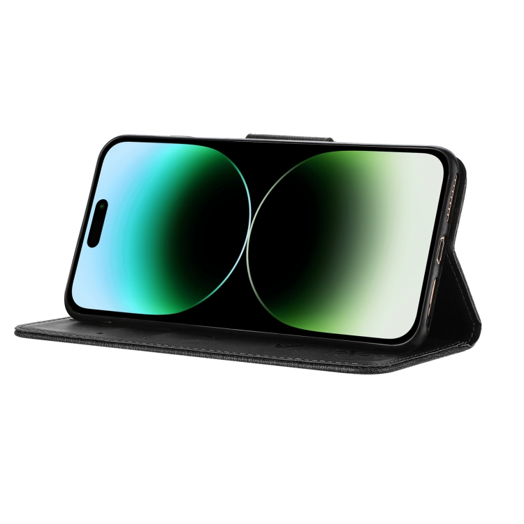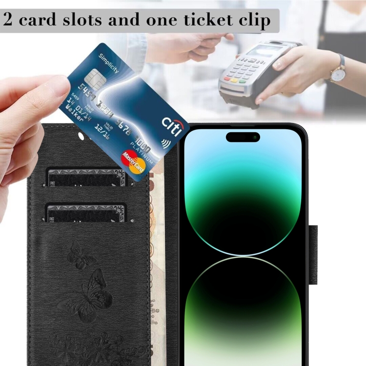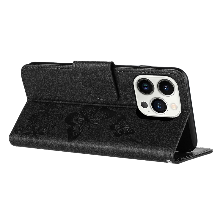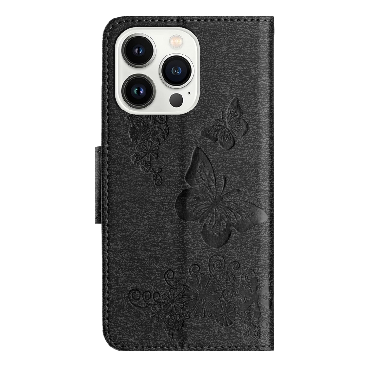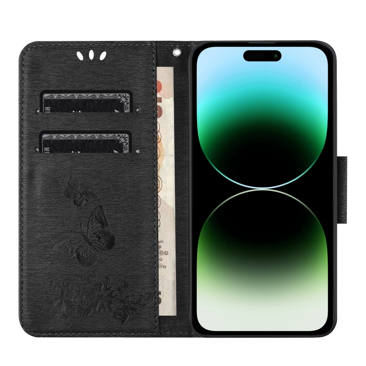 Funda para teléfono iPhone 15 Pro Max cuero con tapa en relieve de mariposa (Negro)