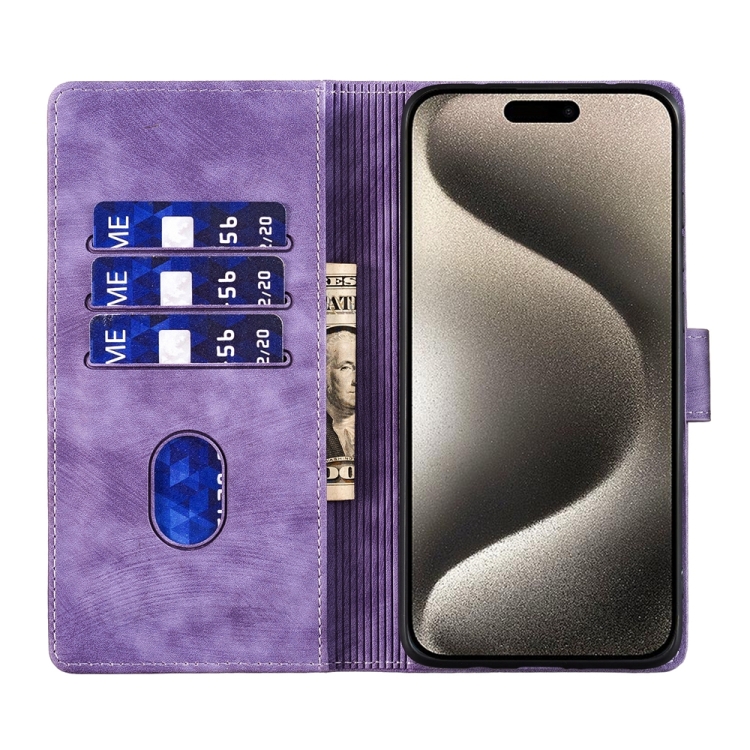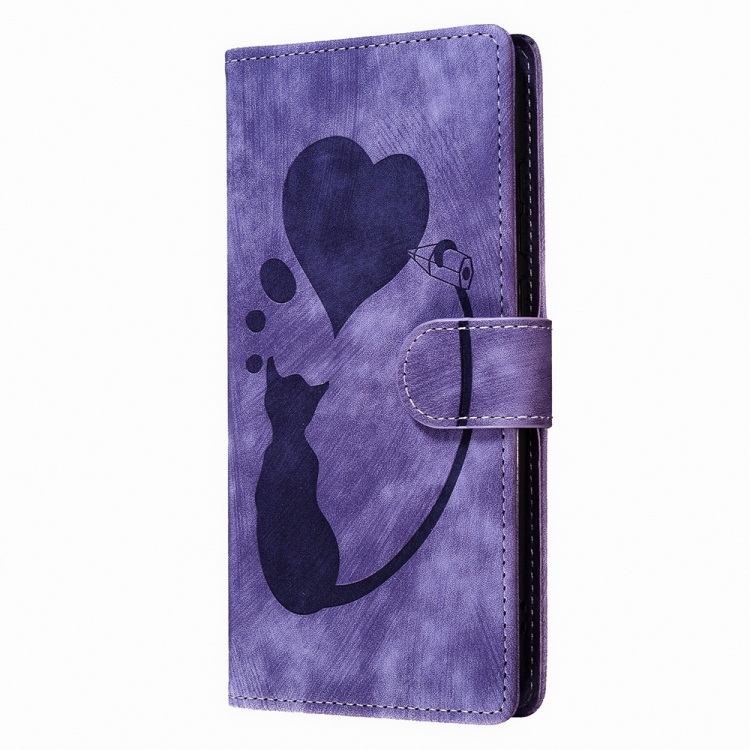 Funda de Cuero para iPhone 15 Pro Pen Heart Cat En Relieve (Púrpura)