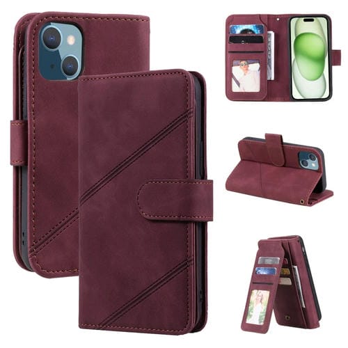 Funda para teléfono iPhone 15 Skin Feel cuero con billetera y múltiples tarjetas (Rojo)