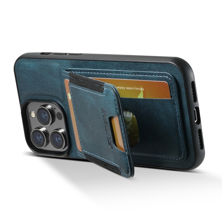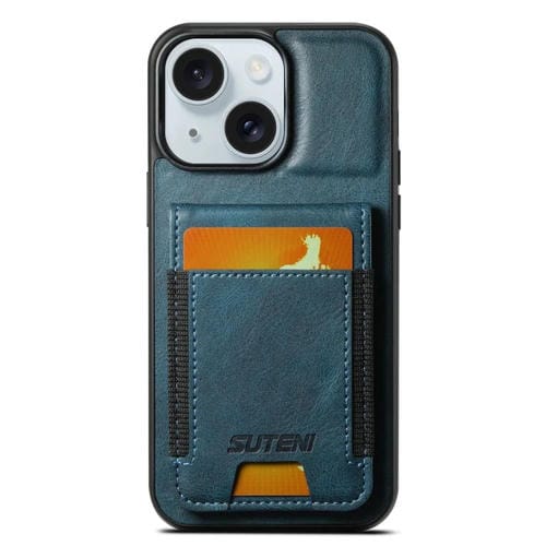 Funda de teléfono Suteni H03 para iPhone 15 con soporte y billetera de cuero con cera de aceite (Azul)