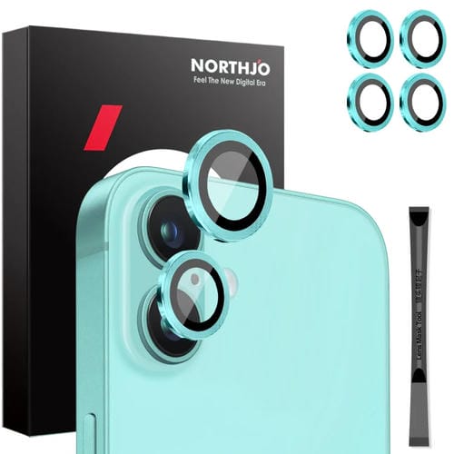 Cubierta Protectora de Lente de Cámara + Película + Anillo de Metal Northjo para iPhone 16/16 Plus (Cian) 2 Juegos 4 Piezas
