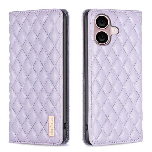 Funda para teléfono iPhone 16 Plus con tapa de cuero magnético Diamond Lattice (Púrpura)
