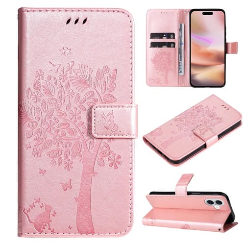Funda para Teléfono iPhone 16 Plus de Cuero con Tapa y Patrón En Relieve de Árbol y Gato (Oro Rosa)