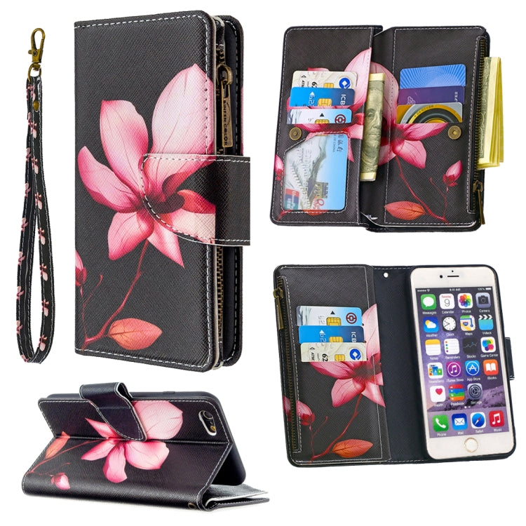 Funda de cuero iPhone 6S Plus y 6 Plus con patrón de colores, cremallera, tapa horizontal, soporte y ranuras para tarjetas (Lotus)