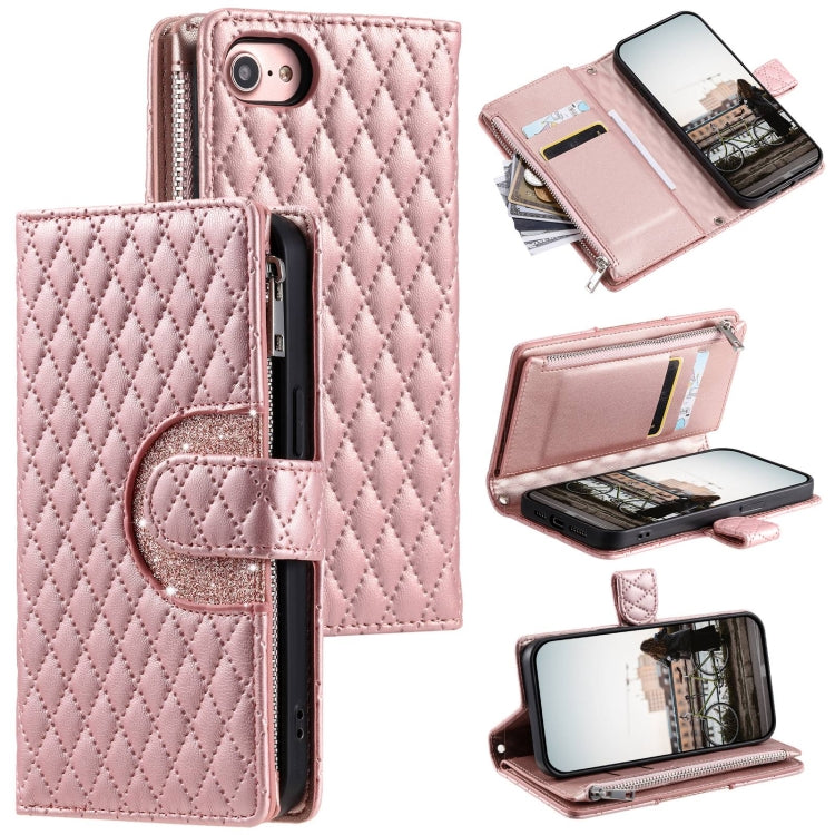 Estuche de Cuero para iPhone 7/8/Se 2022 con Billetera, Cremallera y Celosía con Purpurina (Oro Rosa)