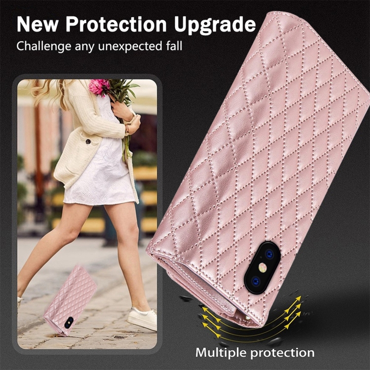 Estuche para Teléfono iPhone X Xs Cuero Rómbico con Billetera MultiTarjeta y Cremallera (Oro Rosa)