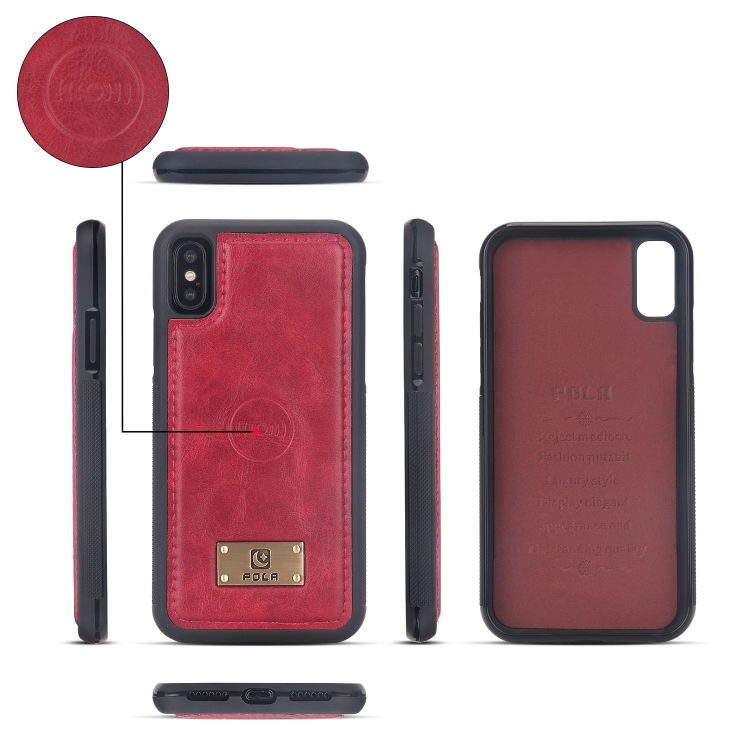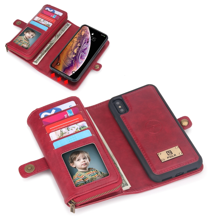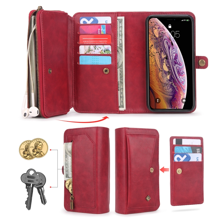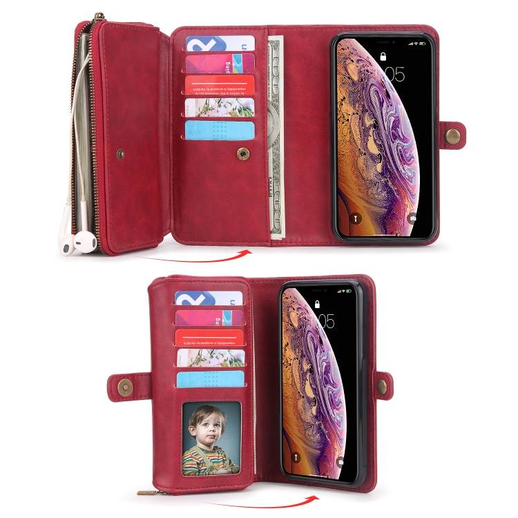 Funda de Cuero para Teléfono iPhone X Xs con Billetera y Cremallera Multifuncional (Rojo)