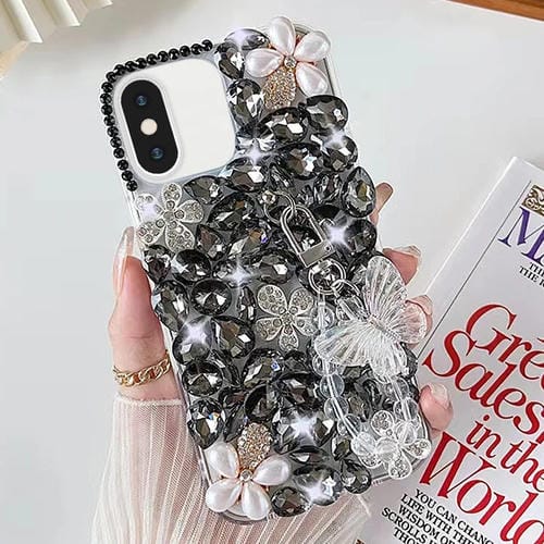 Funda para Teléfono iPhone X Xs con Incrustaciones de Diamantes y Mariposas Hecha a Mano (Negro)