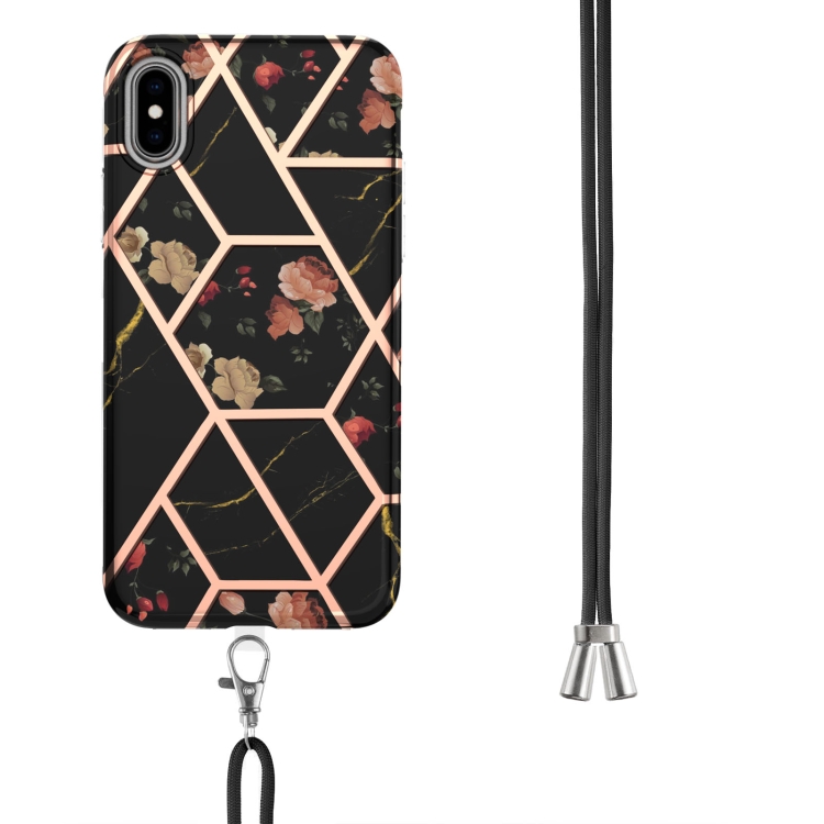 Estuche TPU para iPhone X Xs Galvanoplastia Empalme Mármol Patrón de Flores a Prueba de Golpes con Cordón (Flor Negra)